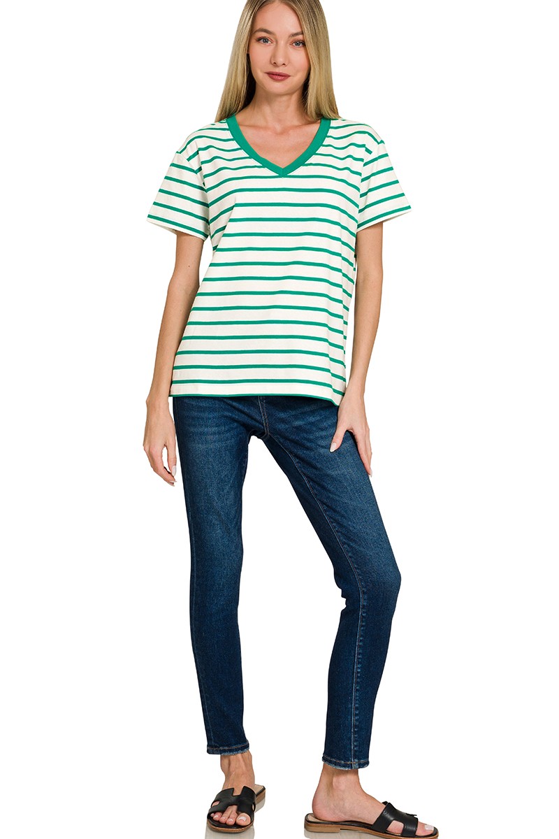 Zenana Striped V-Neck Short Sleeve T-Shirt