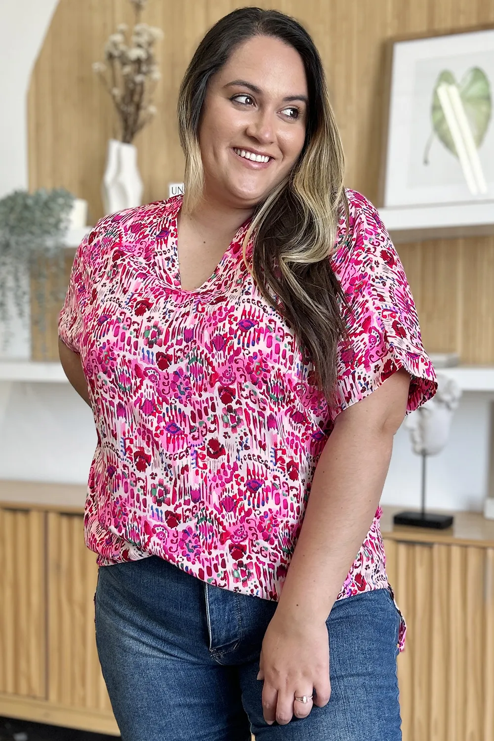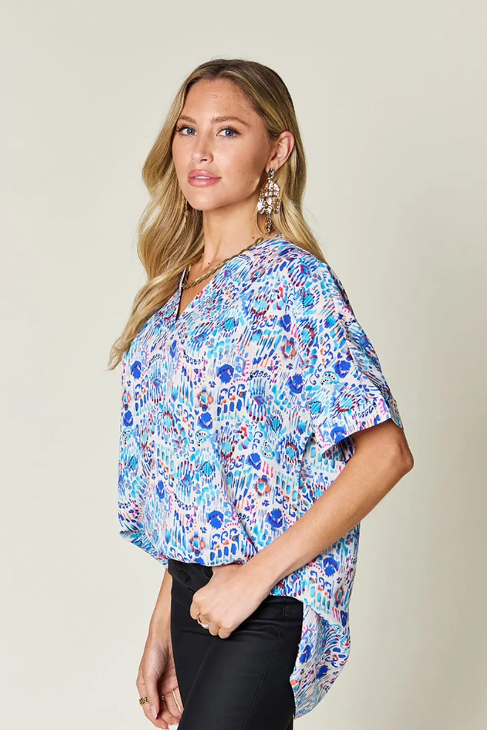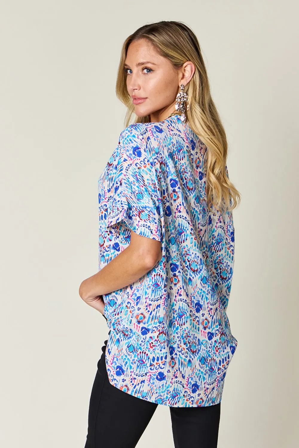 Double Take Full Size Printed V-Neck Short Sleeve Blouse