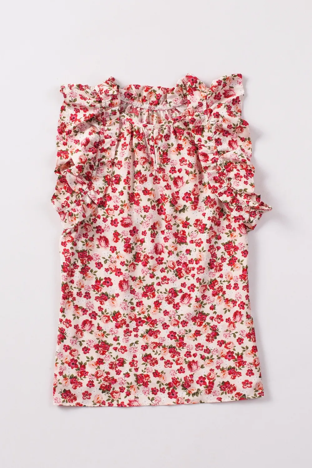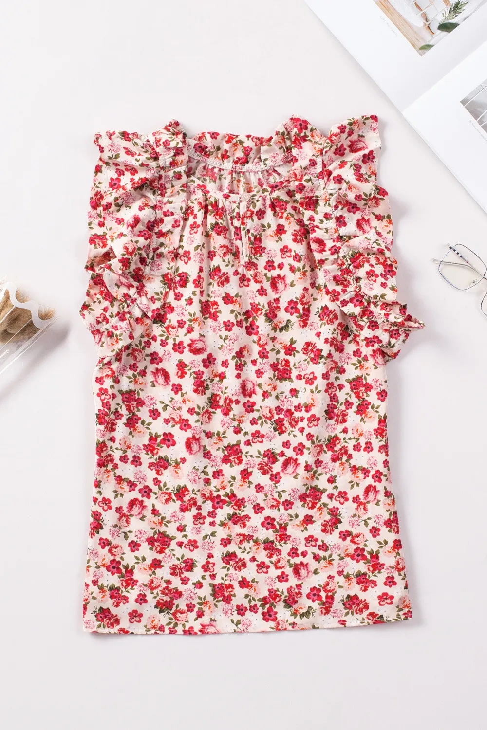 Ruffled Floral Round Neck Cap Sleeve Blouse