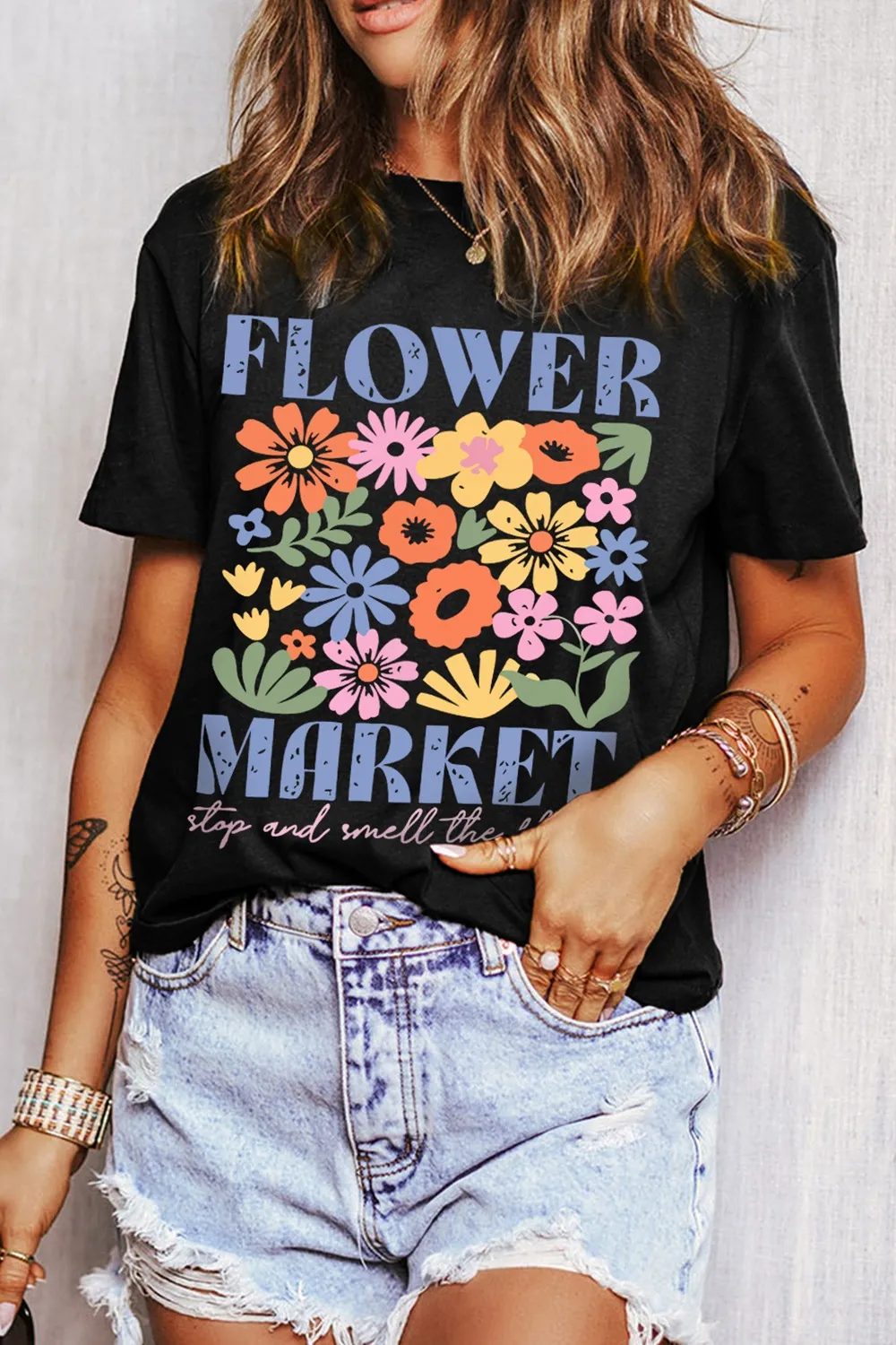 Flower Market Graphic Round Neck T-Shirt