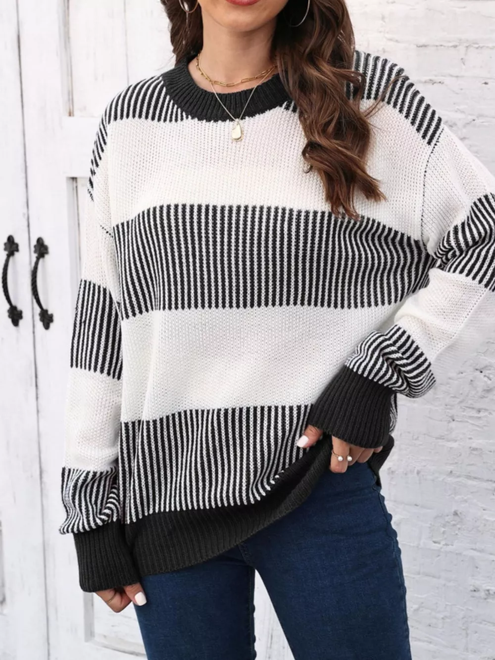 Full Size Color Block Dropped Shoulder Sweater Plus Size