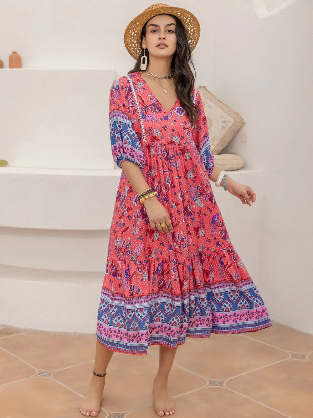 Printed Puff Sleeve Midi Dress