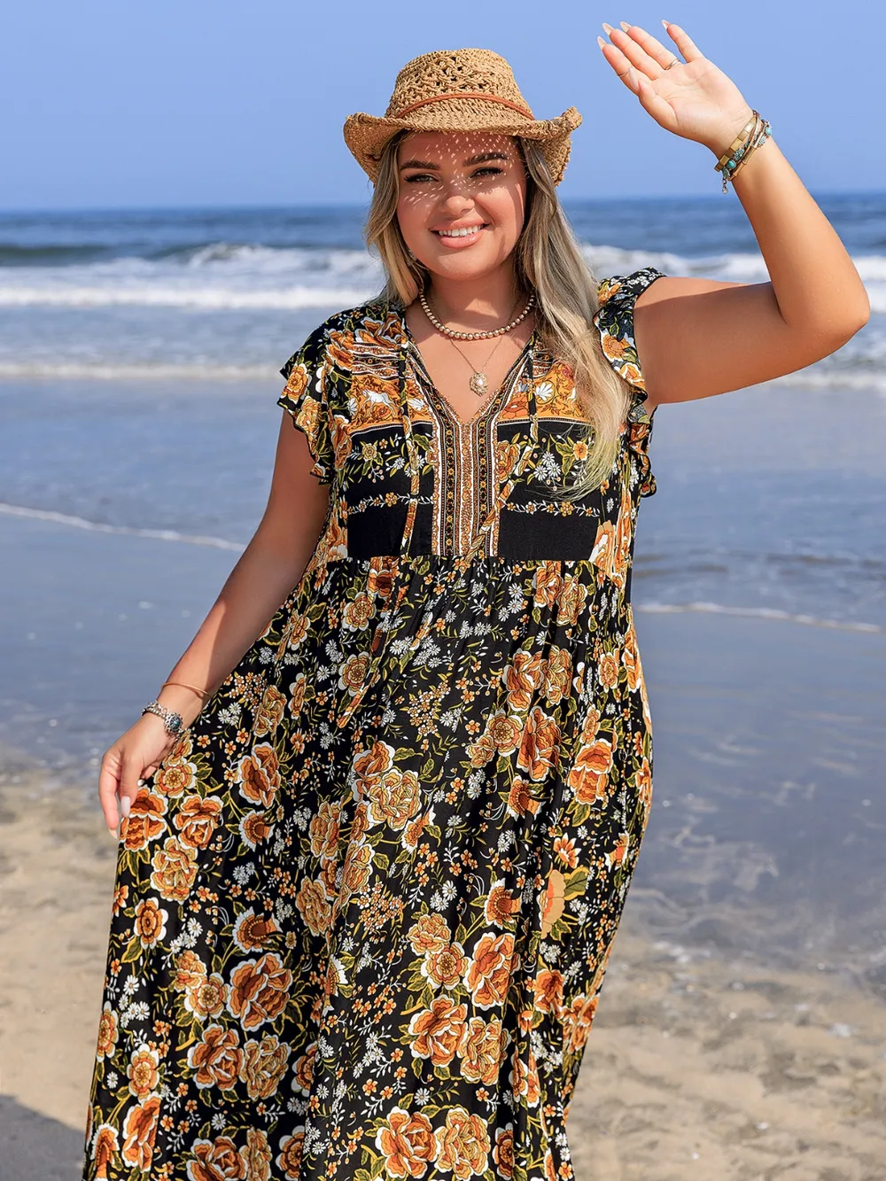 Plus Size Printed V-Neck Ruffle Cap Sleeve Maxi Dress