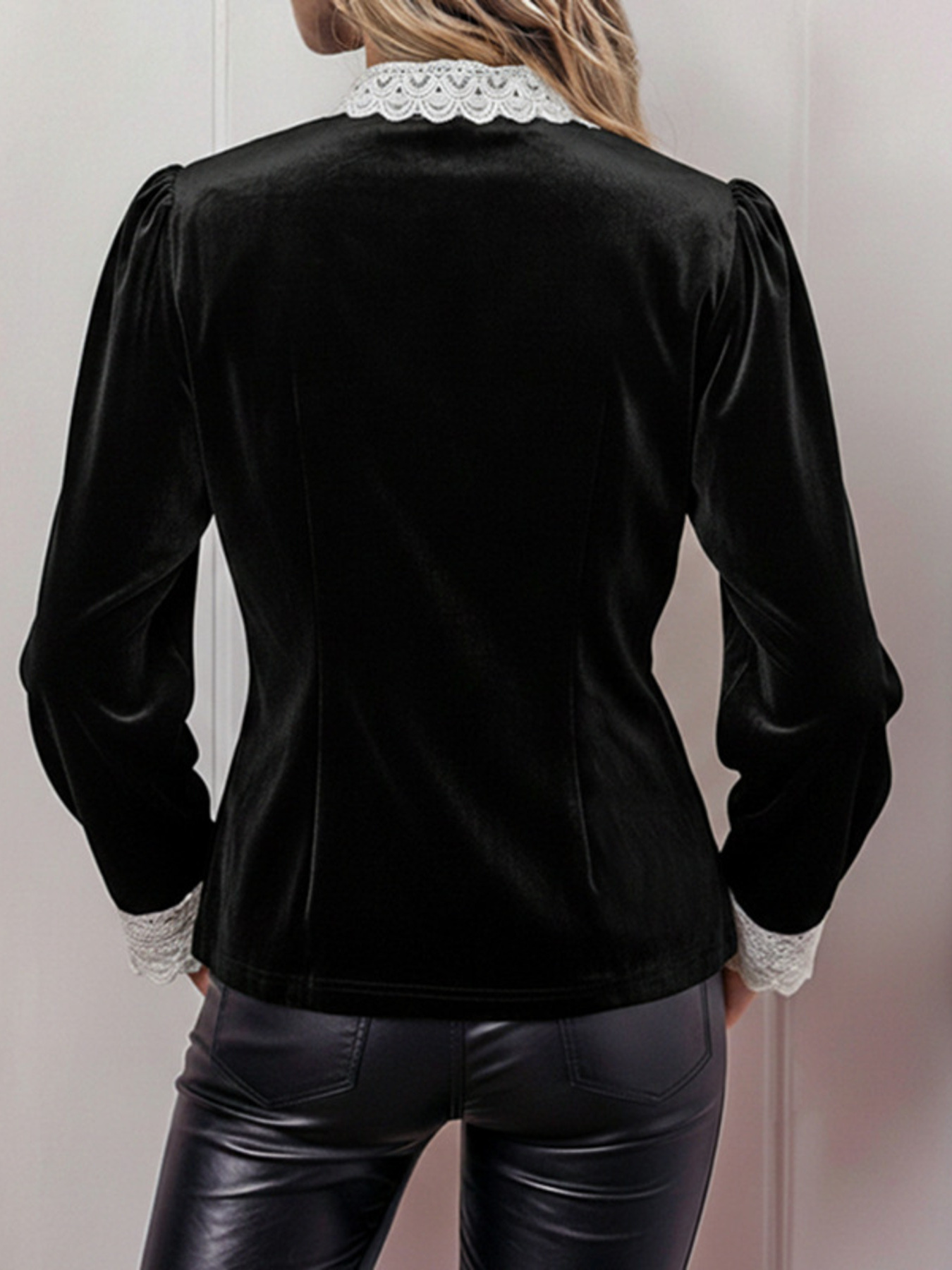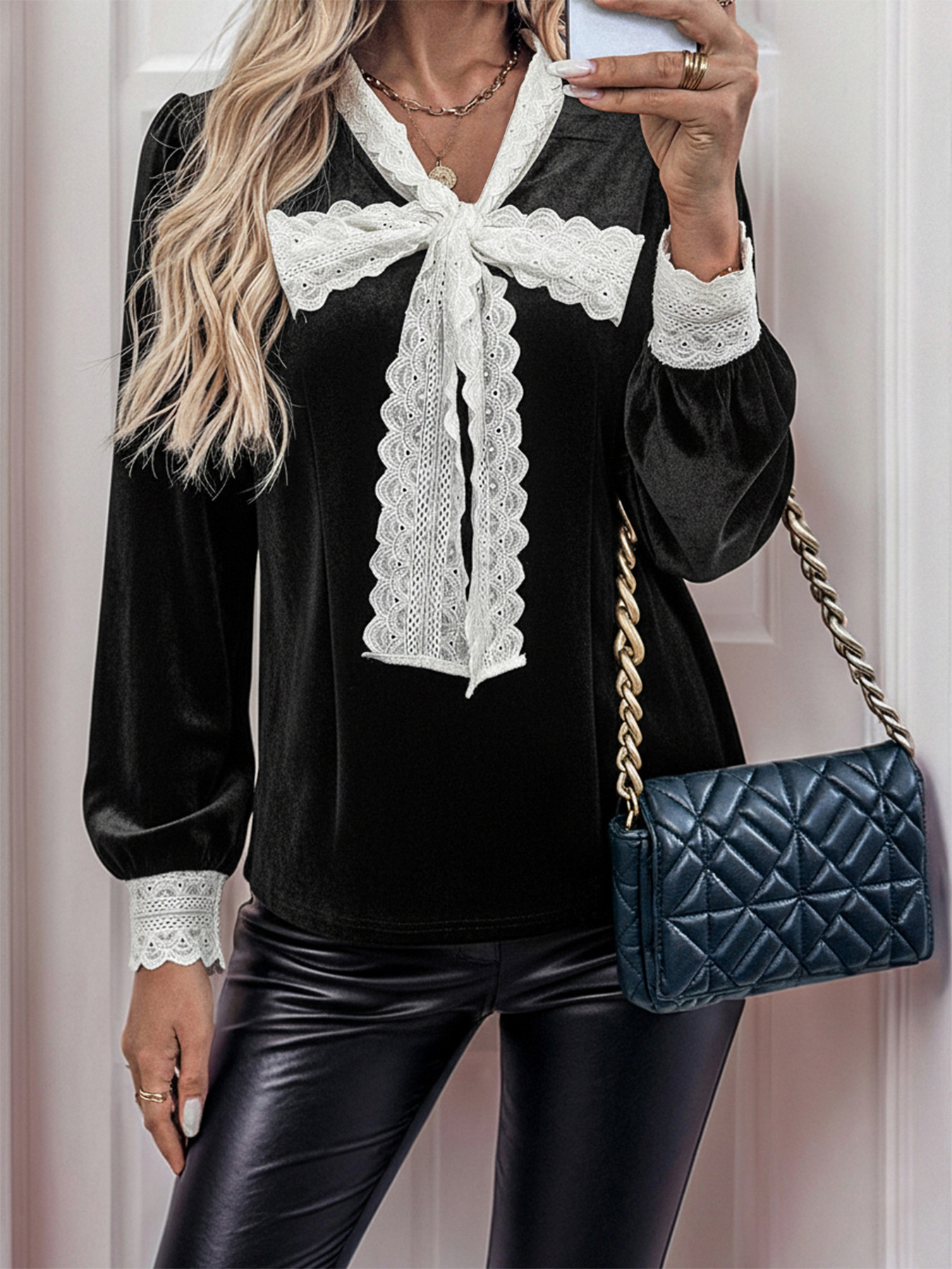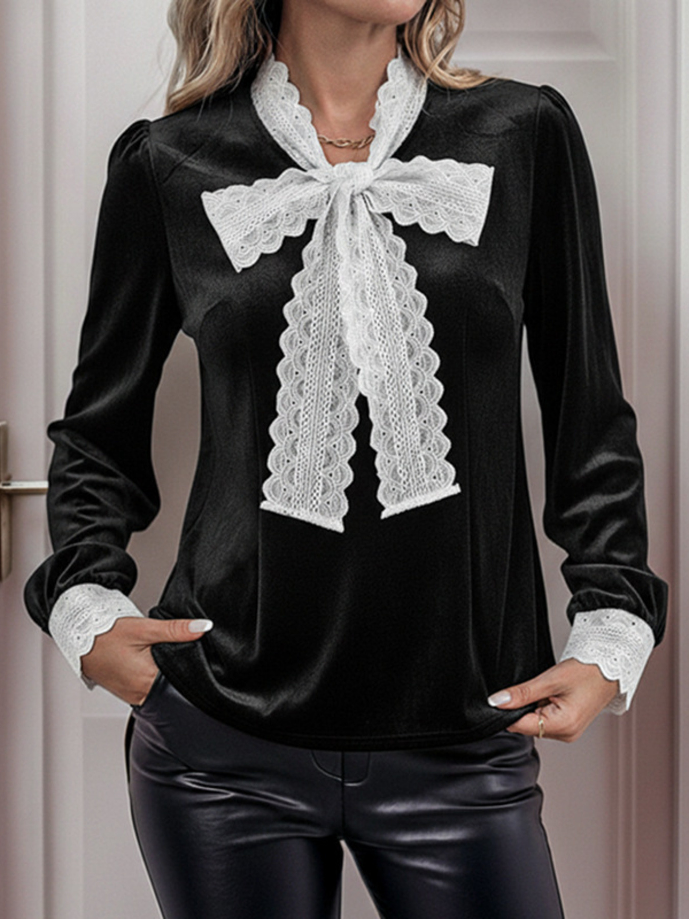 Lace Bow Tie Velvet Blouse