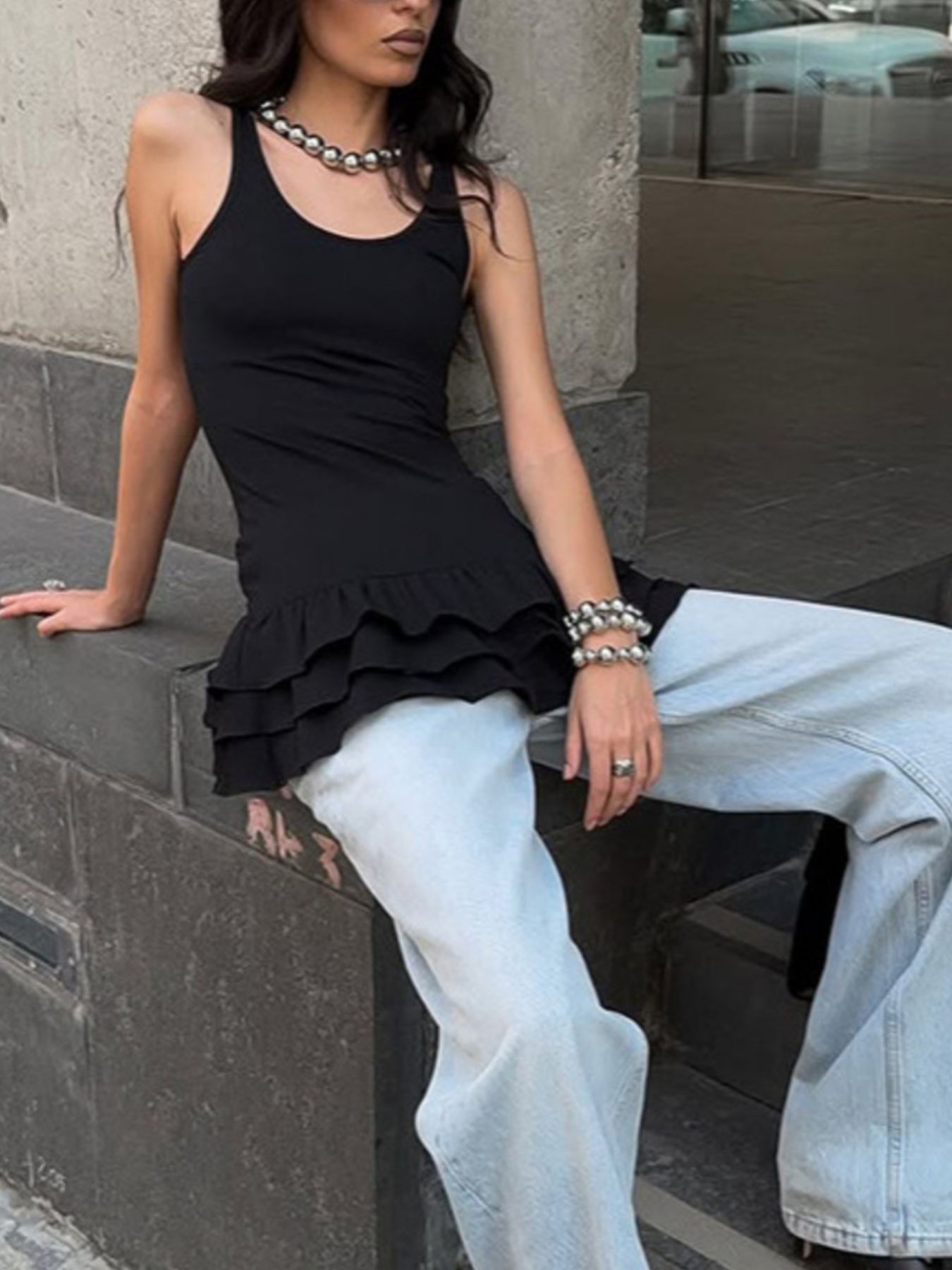 Ruffled Hem Round Neck Tank