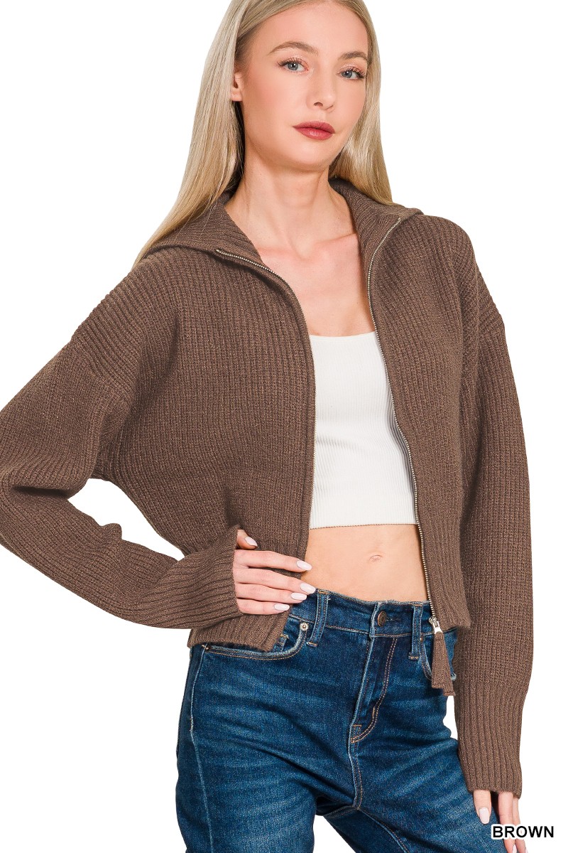 Zenana Ribbed Collared Zip Up Sweater Cardigan
