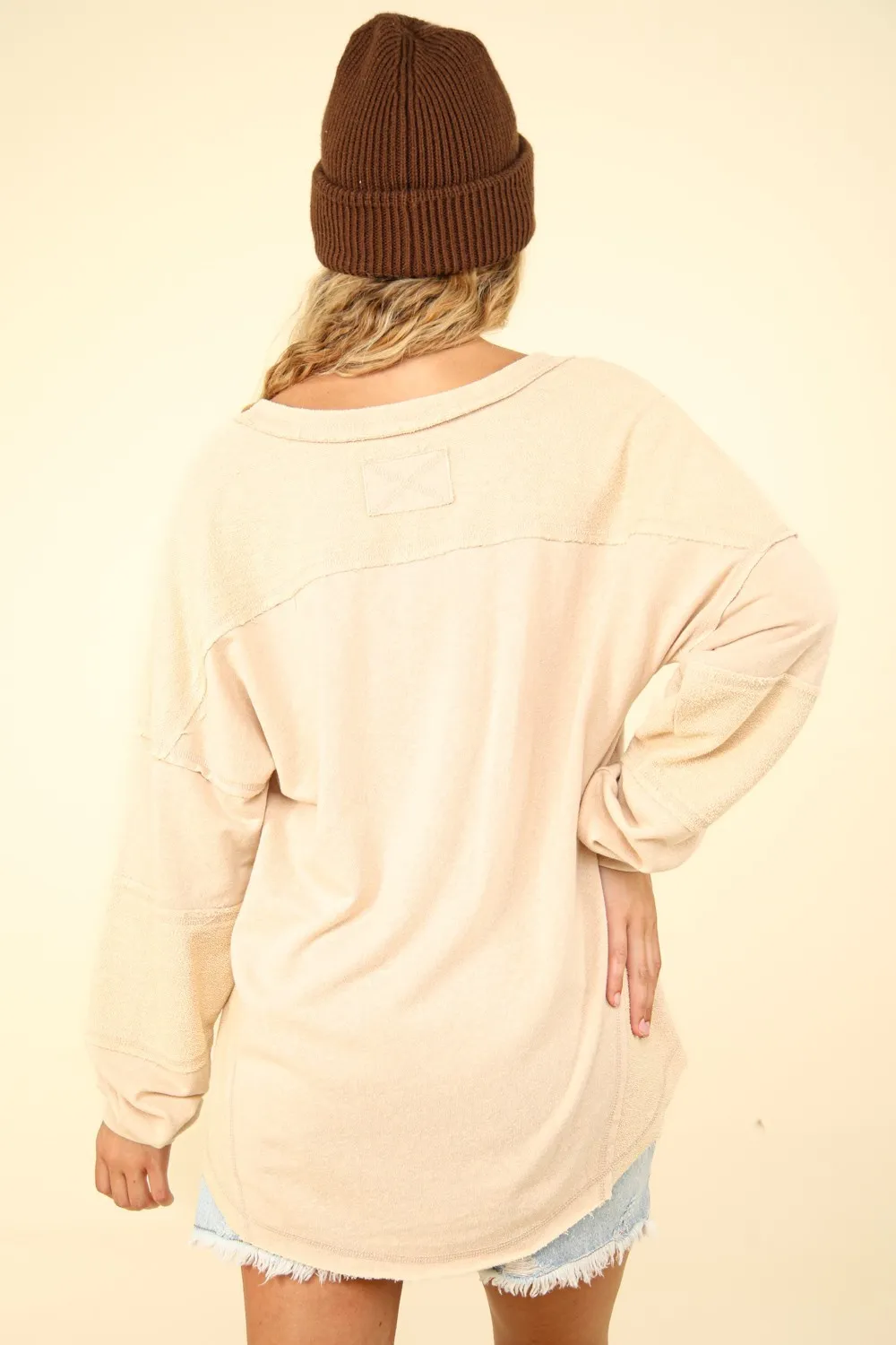 Very J Washed V-Neck Exposed Seam Knit Top