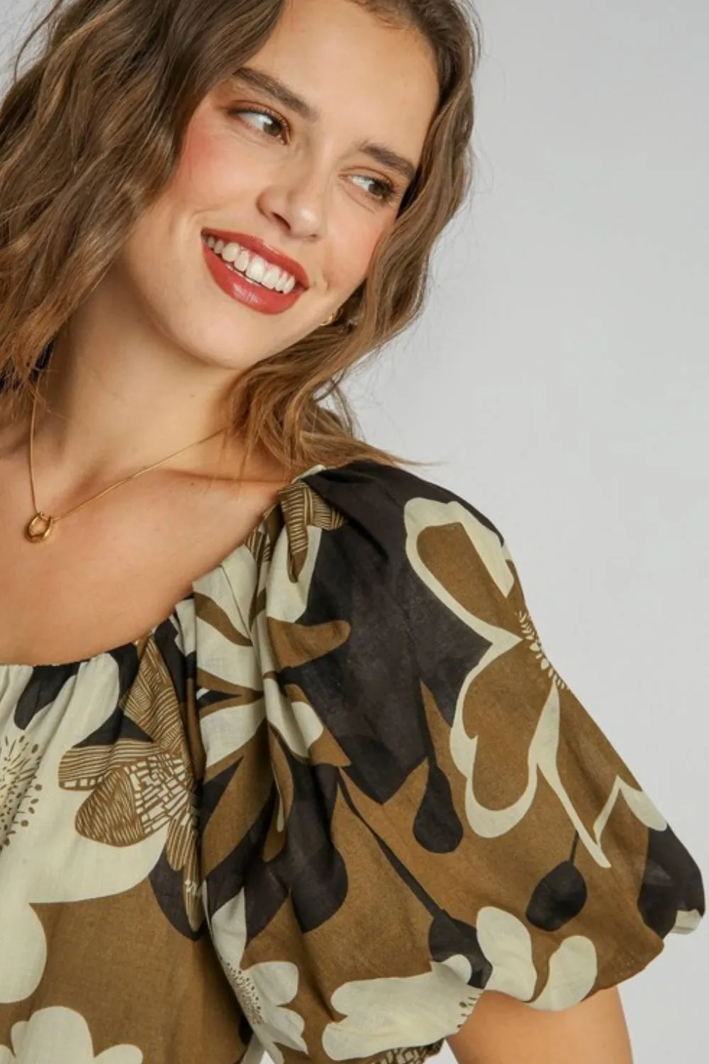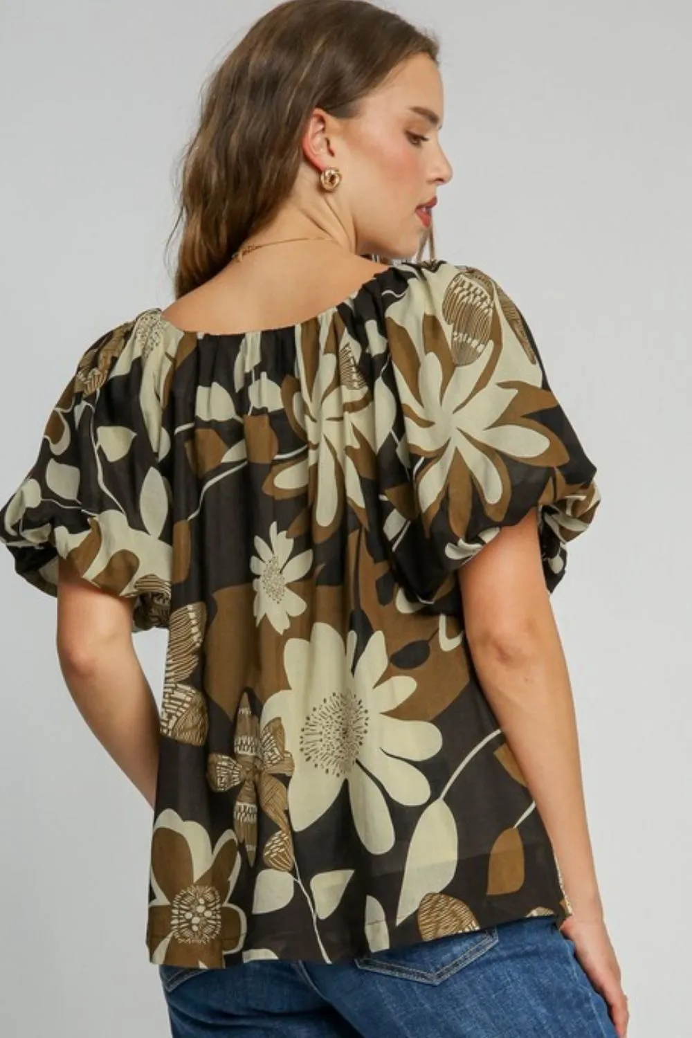 Umgee Full Size Print Round Neck Puff Sleeve Top Plus Size