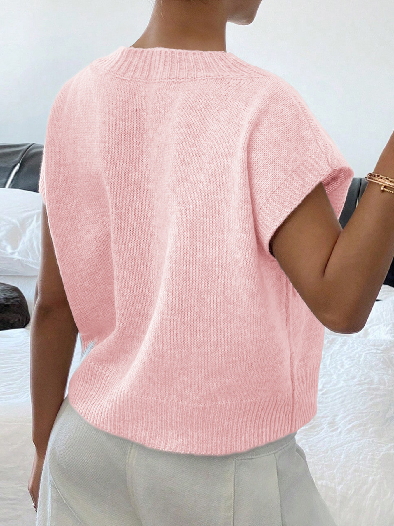 Ribbed Hem V-Neck Short Sleeve Sweater
