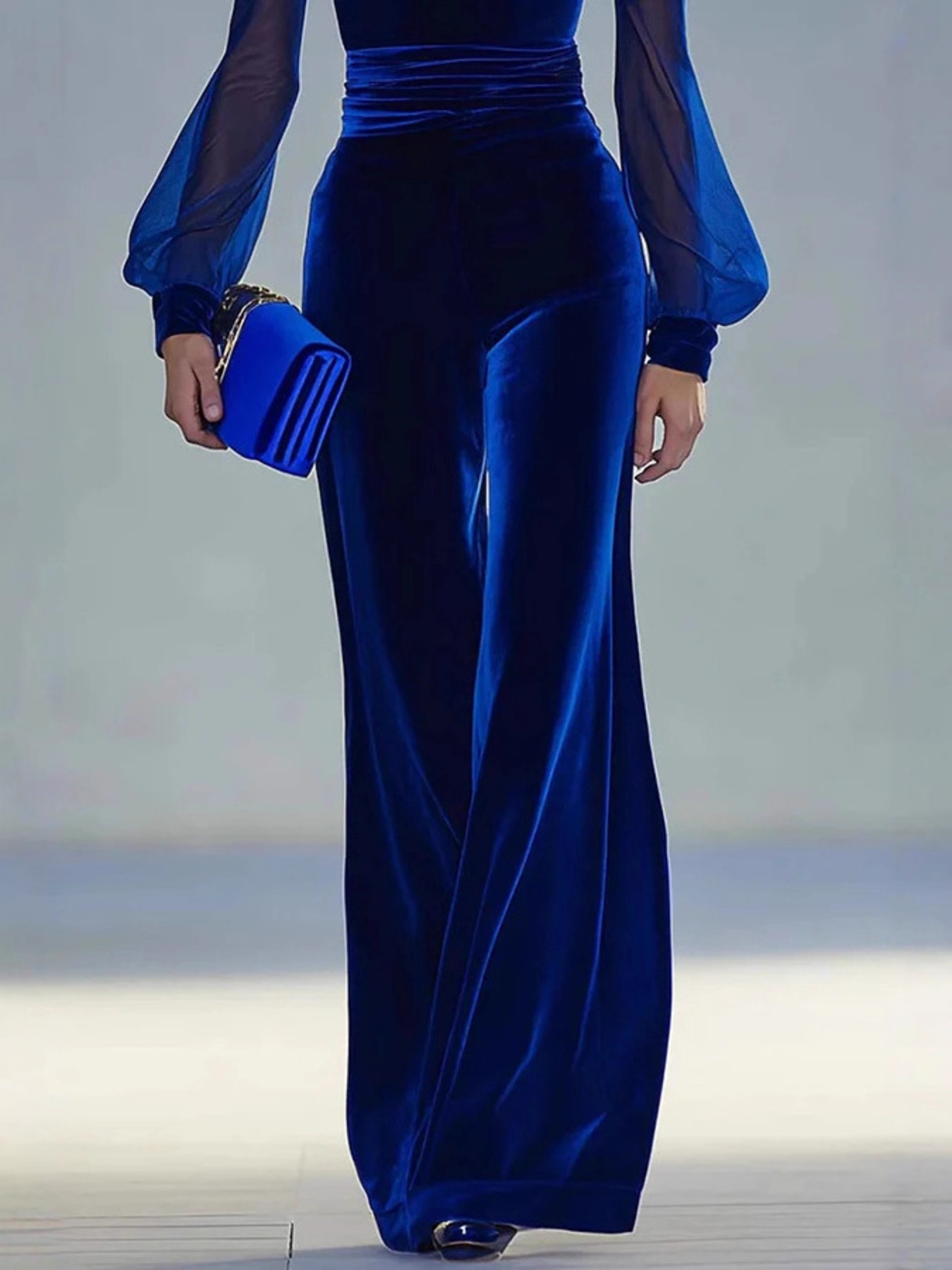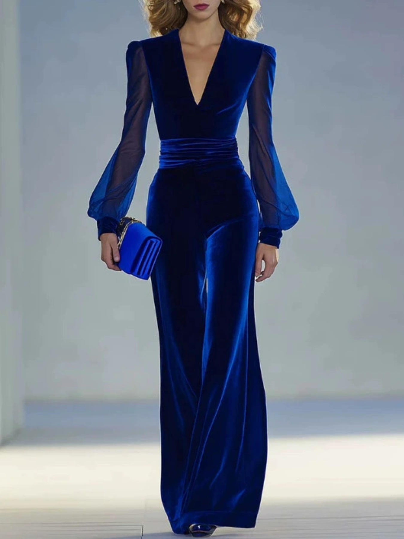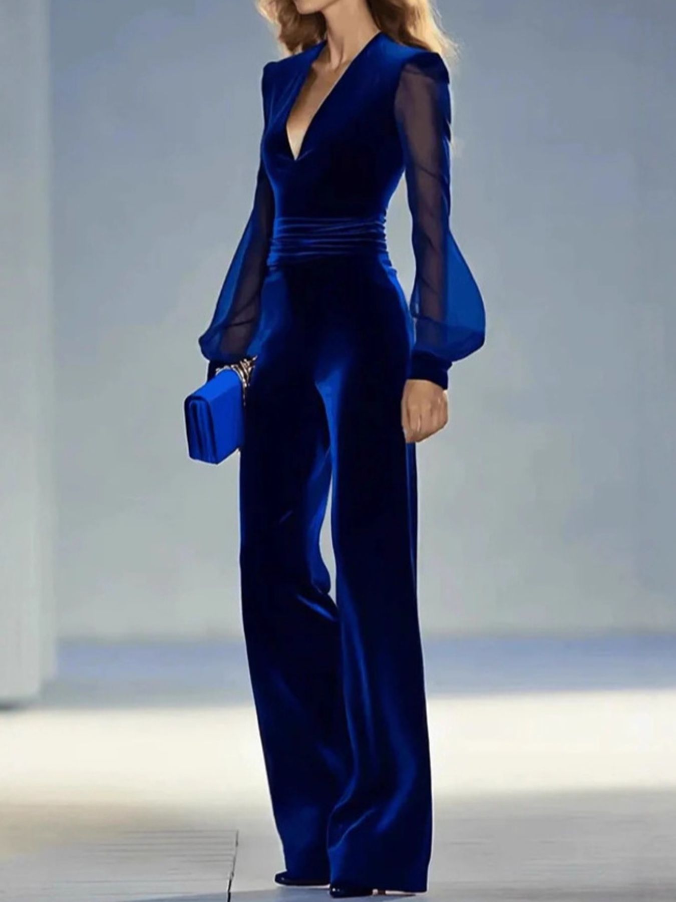 Velvet Wide Leg Jumpsuit With Sheer Sleeves