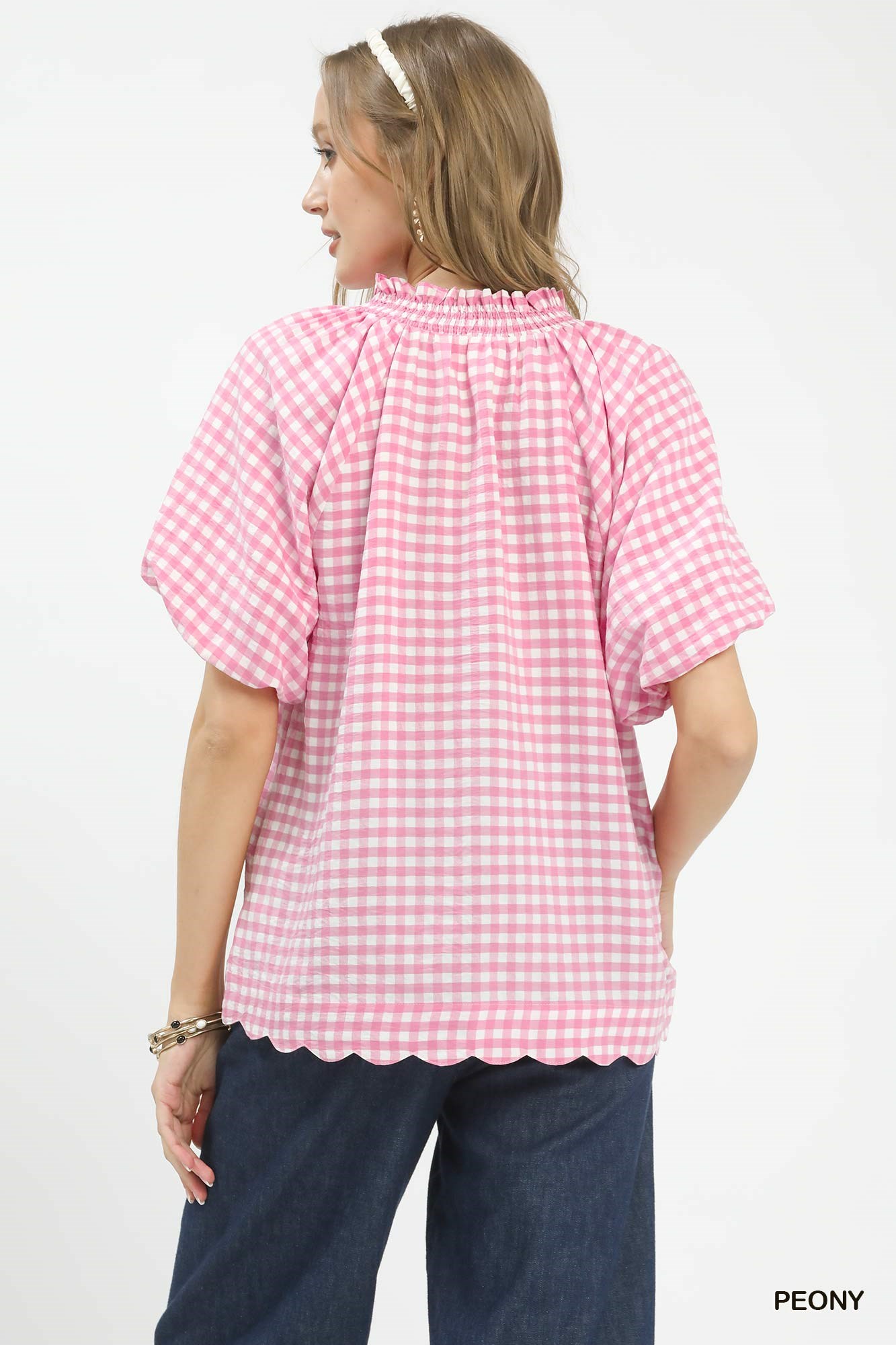 Umgee Gingham Bubble Sleeve Blouse With Scallop Hem