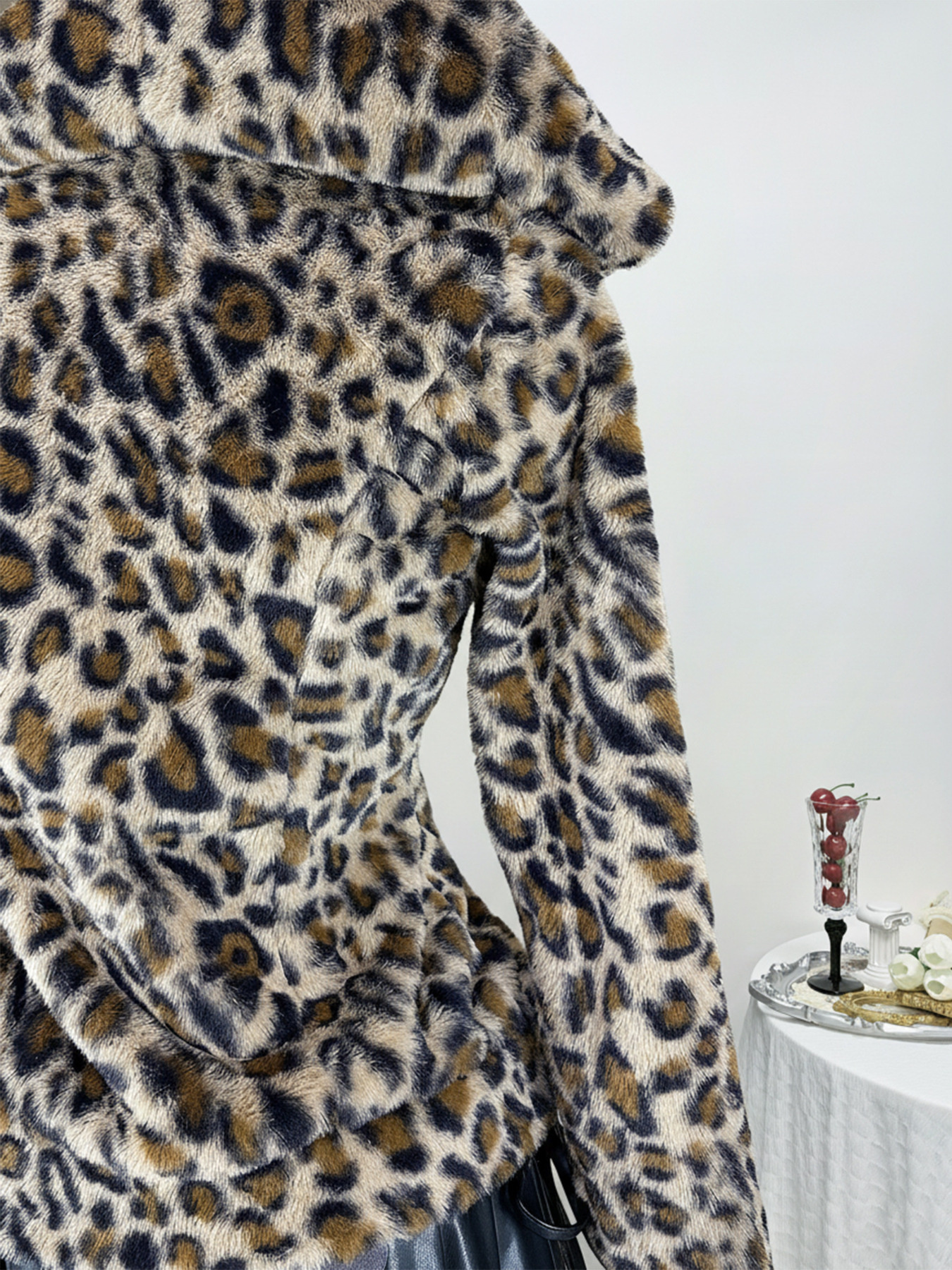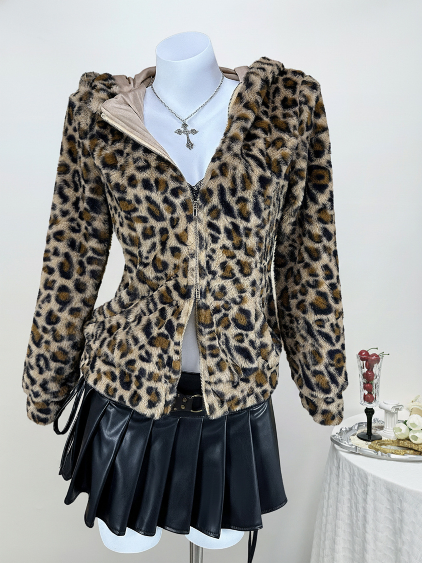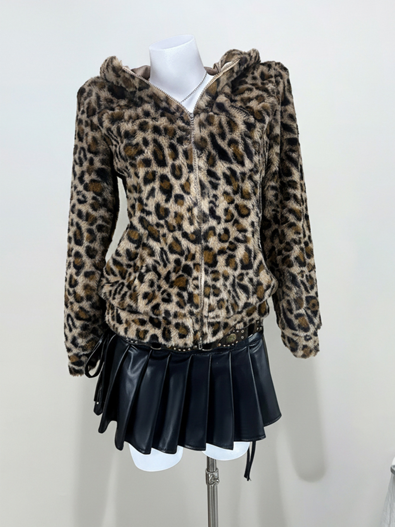 Leopard Plush Zip-Up Hooded Outerwear