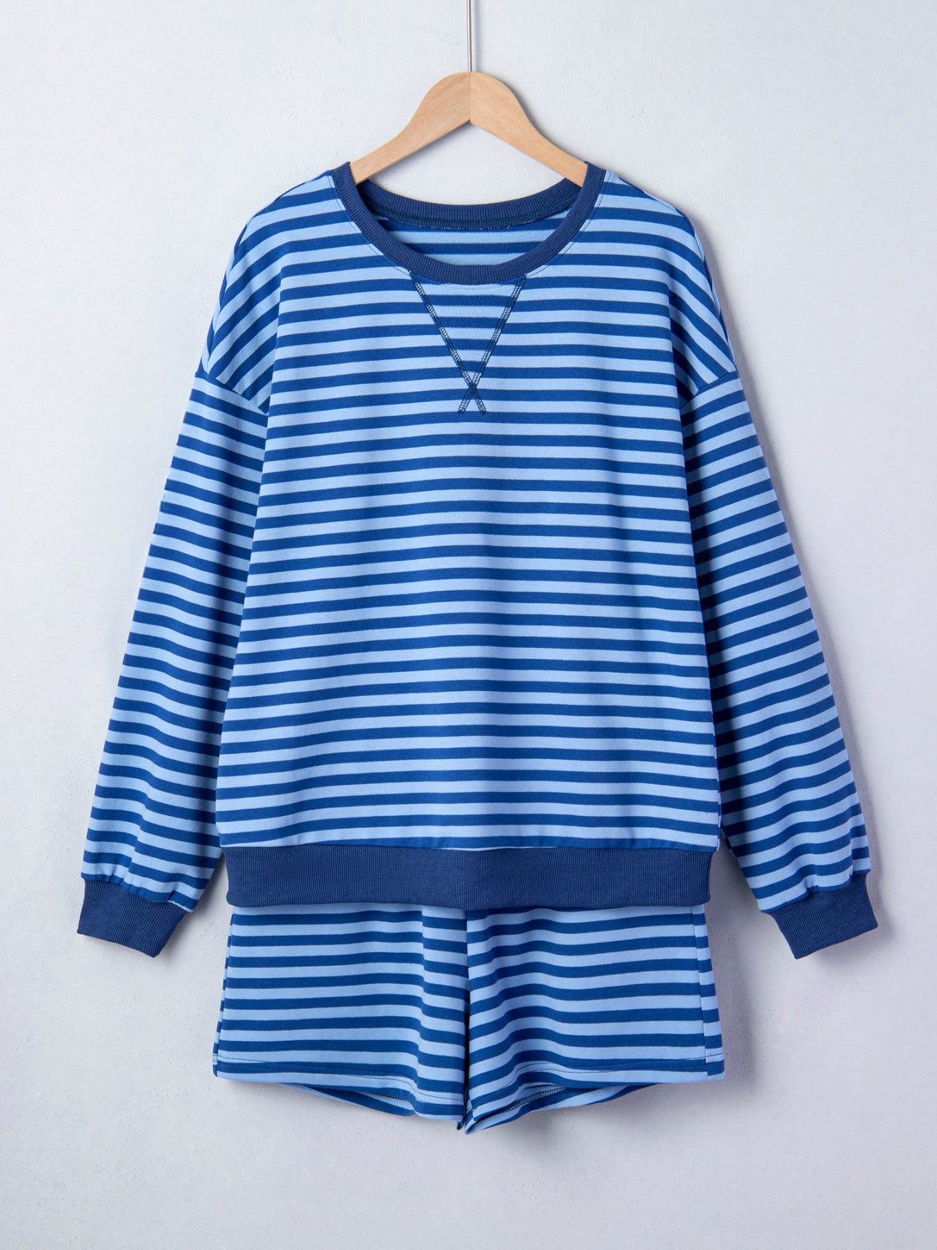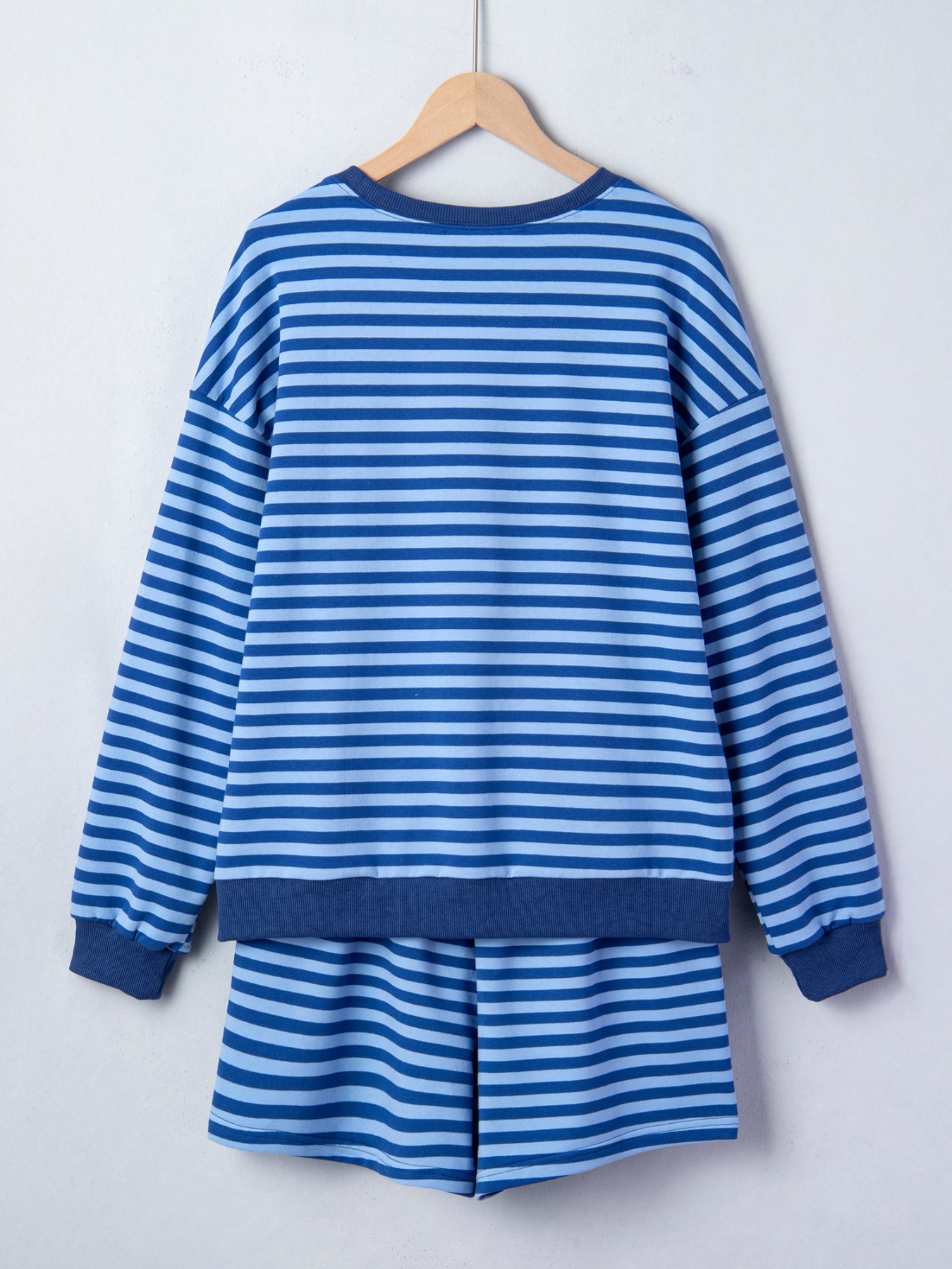 Stripe Drop Shoulder Long Sleeve Pullover Elastic Waist Casual Short Set