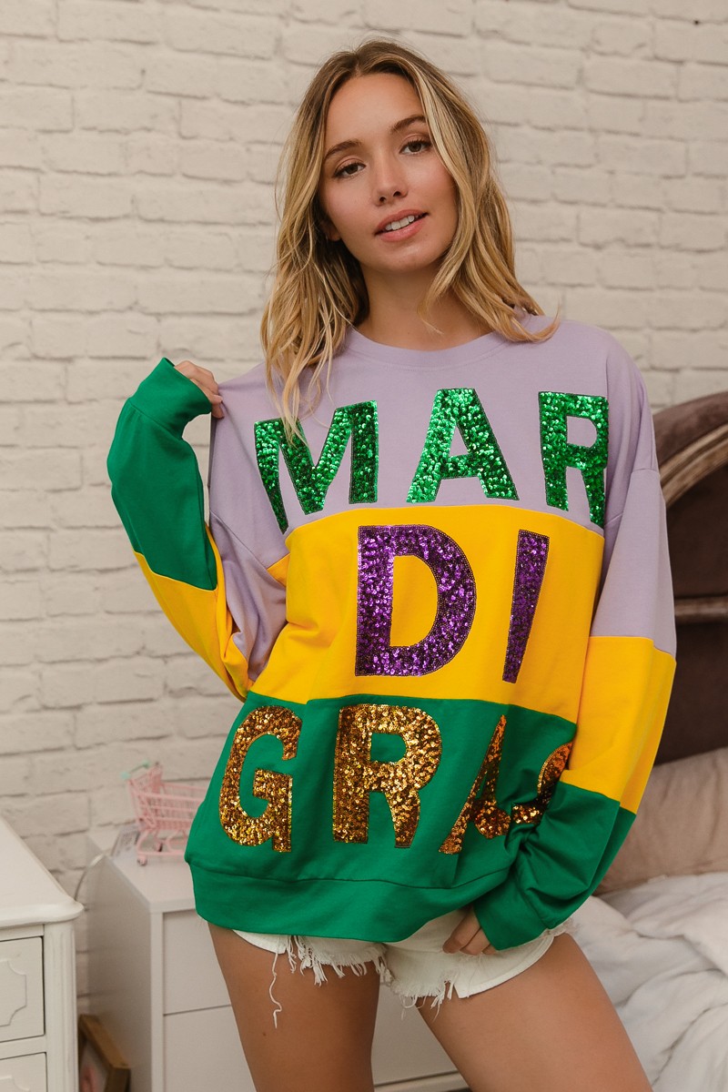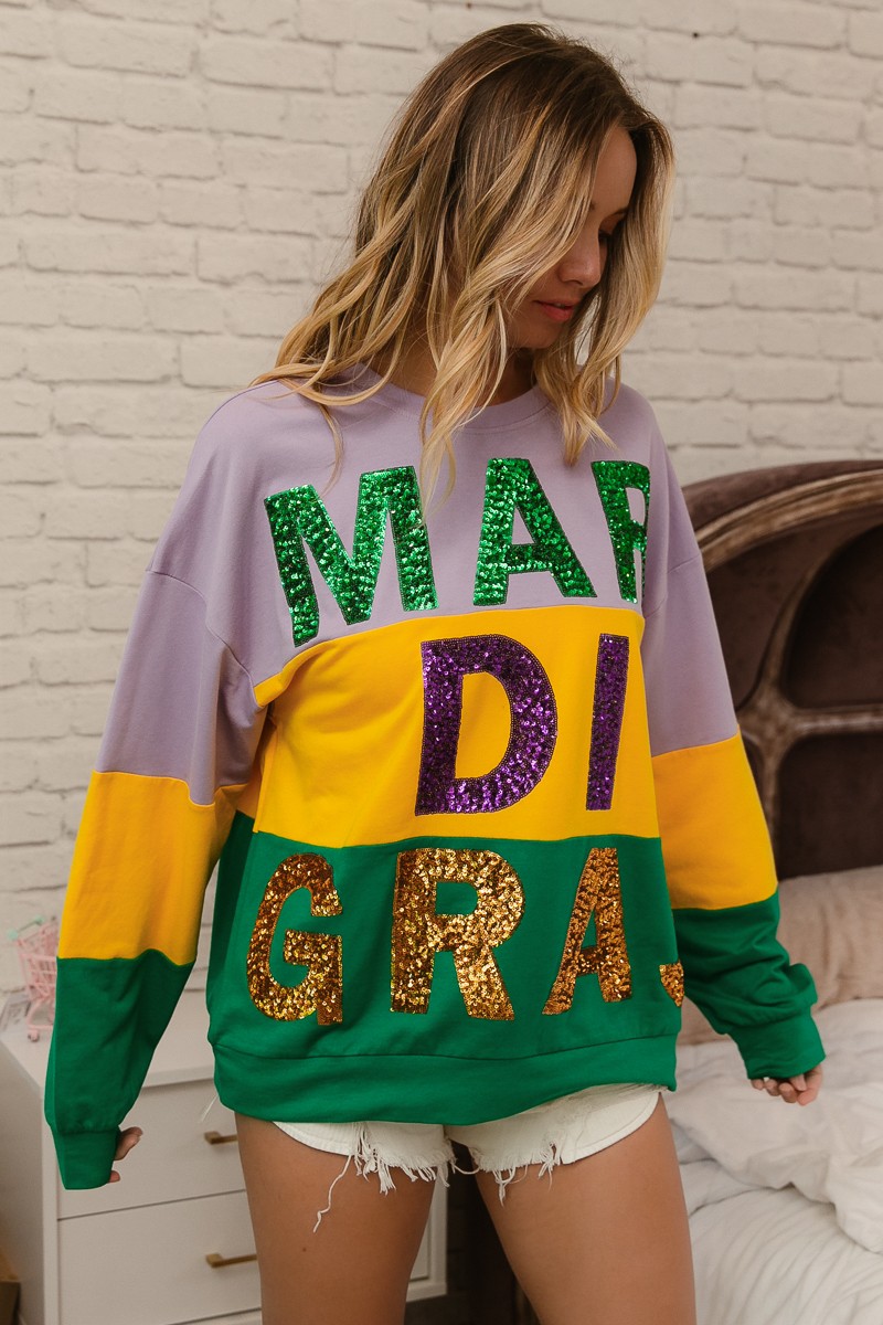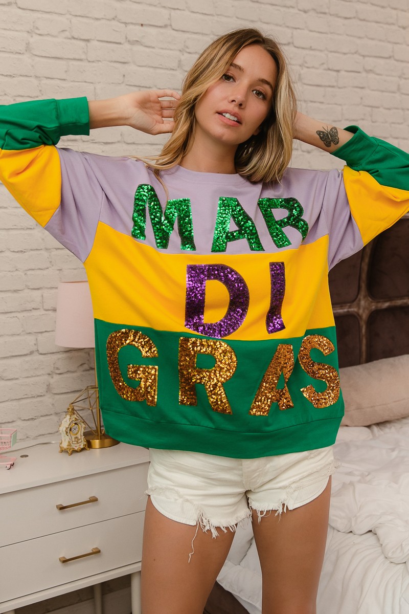Bibi Sequin Mardi Gras Lettering Color Block Sweatshirt