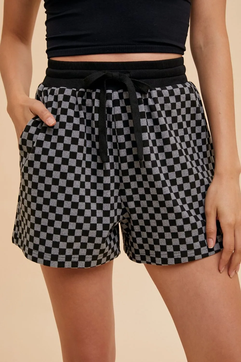 Annie Wear Checkered Round Neck Top And Drawstring Shorts Set