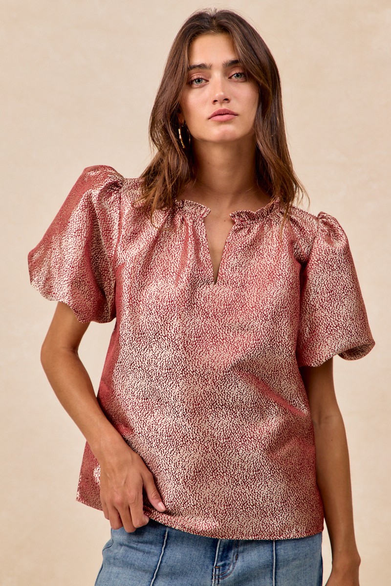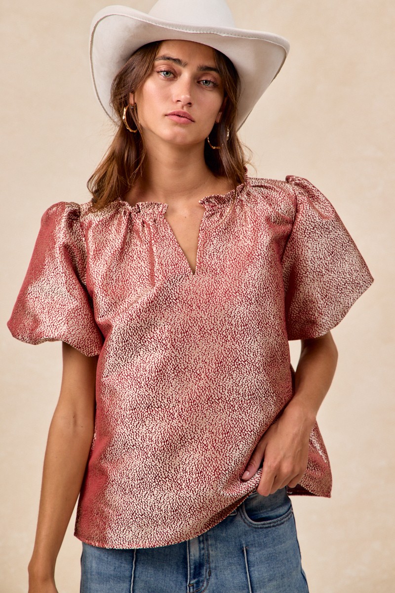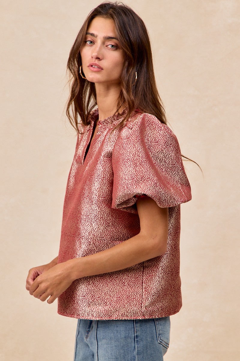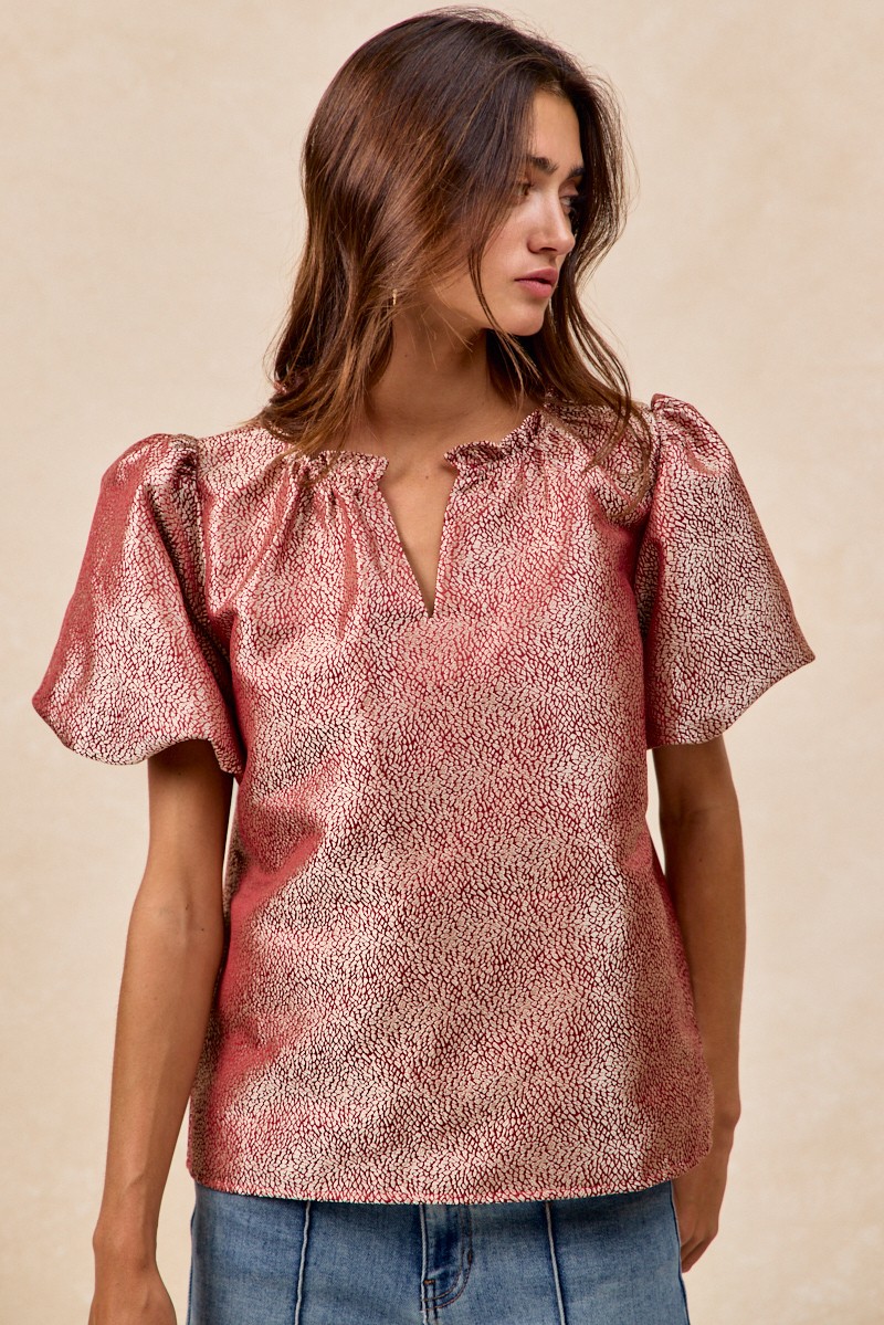 Bibi Jacquard Woven Short Balloon Sleeves V Neck Top